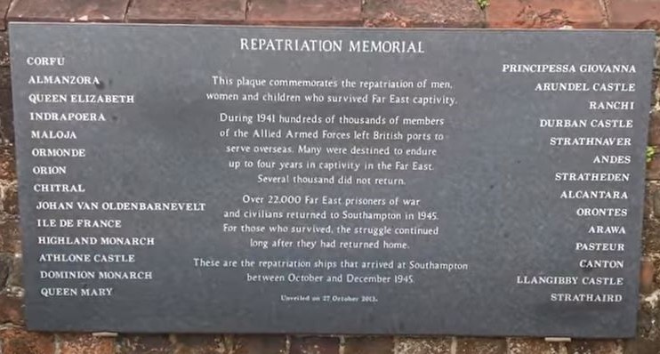 Town Quay Park is home to a memorial plaque which “commemorates the repatriation of men, women, and children who survived Far East captivity,” and were brought back to the UK on ships arriving in Southampton between October and December 1945.